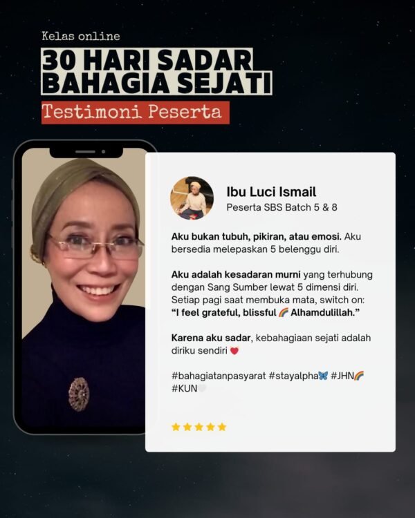 Merupakan Kelas Online selama 30 Hari, untuk membangun kesadaran diri, menemukan kebahagiaan sejati dari dalam, dan menciptakan hidup yang lebih tenang, sehat, lapang, berkelimpahan dan bahagia.